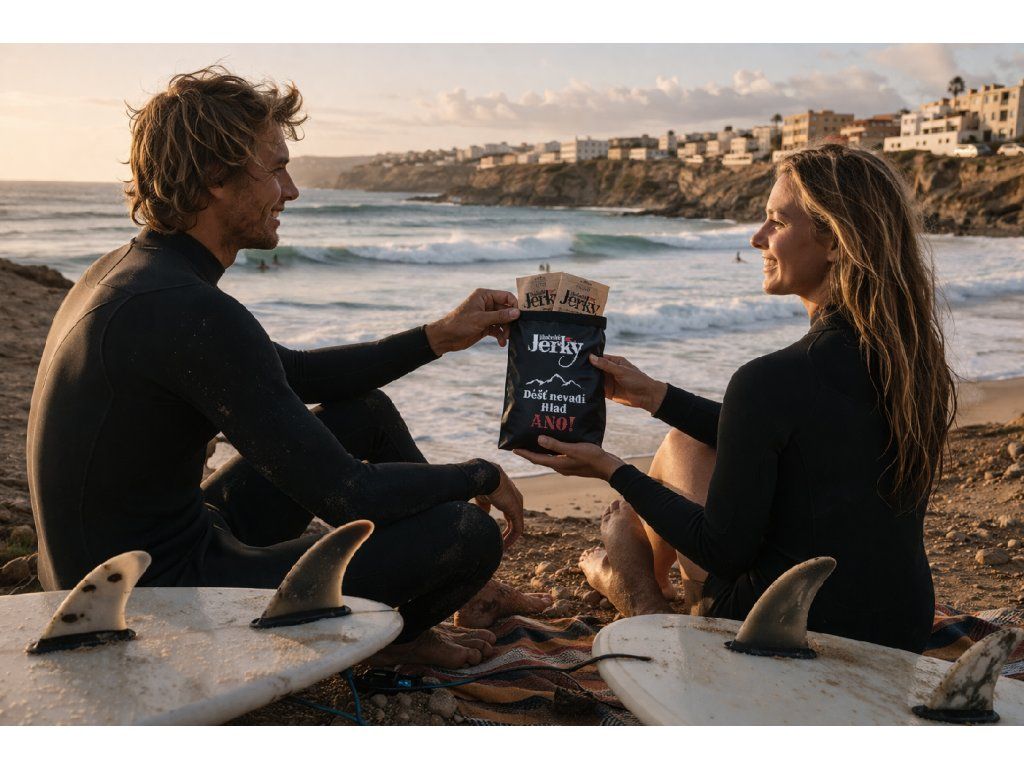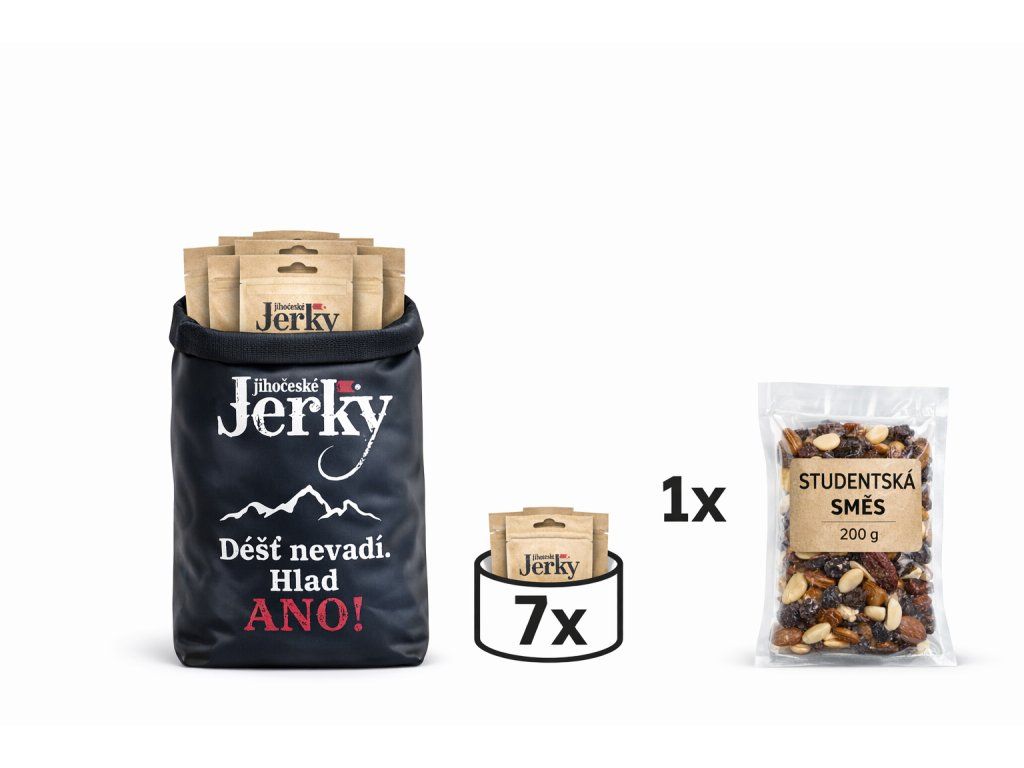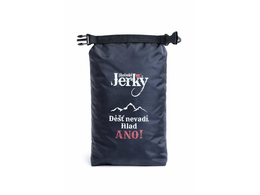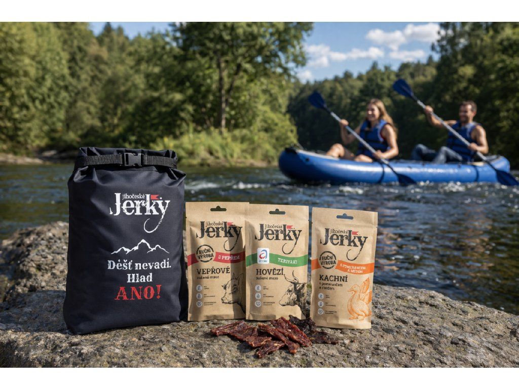 Voděodolný vak plný poctivého snacku – jerky a směs oříšků na rychlou energii. Ideální parťák na výšlapy, řeku, oceán, kempování i krizovky. Déšť nevadí. Hlad ANO!