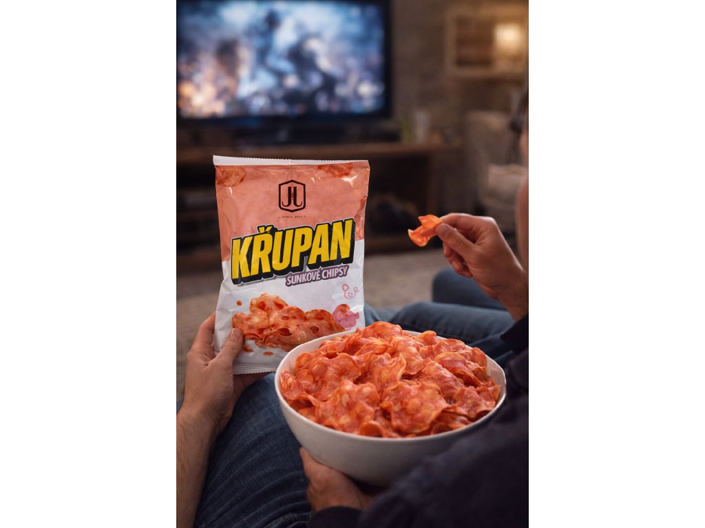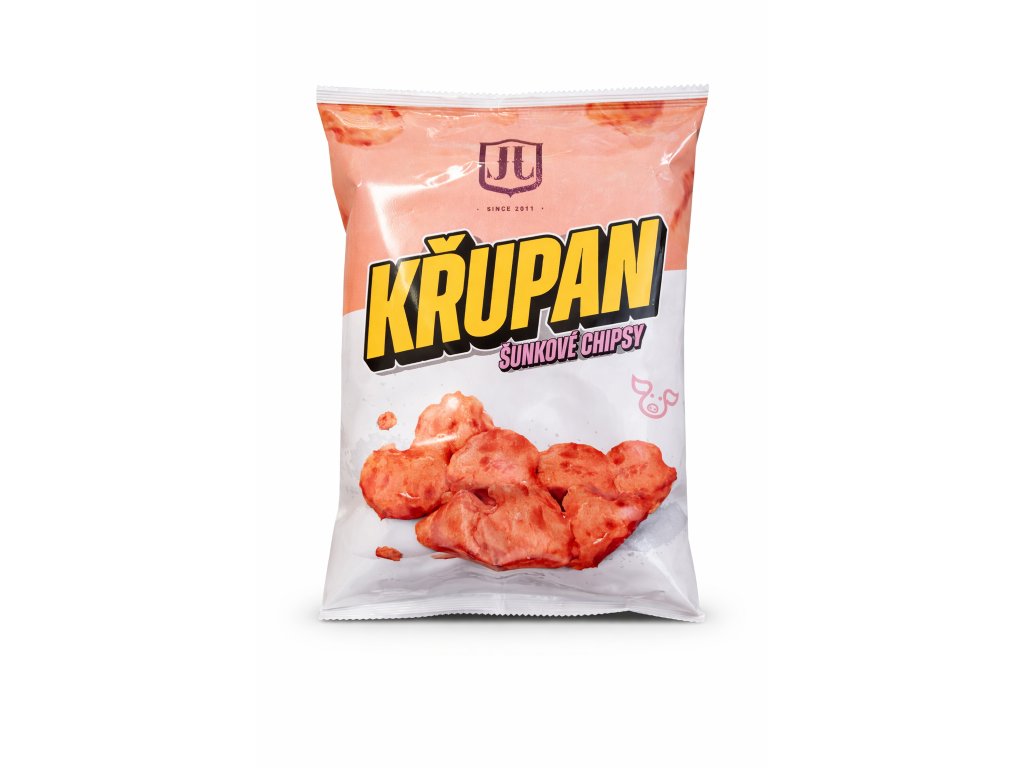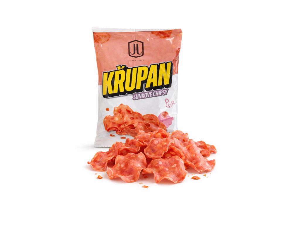 Křupan šunkové chipsy 40g - masný výrobek trvanlivý, tepelně opracovaný.