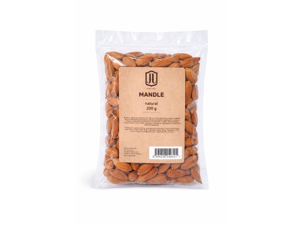 Složení: Jádra mandlí natural 100 %. Může obsahovat stopy arašídů, jiných skořápkových plodů, sezamu a lepku. Skladujte v suchu a chladu, nevystavujte přímému slunečnímu světlu. Chraňte před malými dětmi, hrozí riziko zadušení. Alergeny vyznačeny ve složení tučným písmem.
