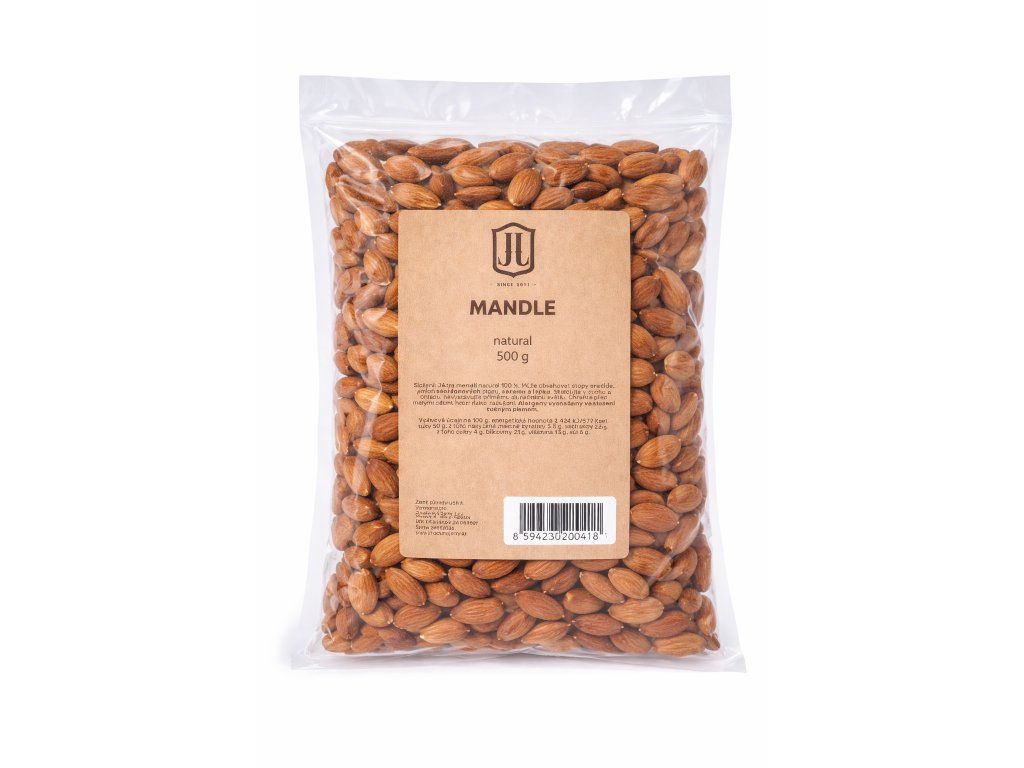 Složení: Jádra mandlí natural 100 %. Může obsahovat stopy arašídů, jiných skořápkových plodů, sezamu a lepku. Skladujte v suchu a chladu, nevystavujte přímému slunečnímu světlu. Chraňte před malými dětmi, hrozí riziko zadušení. Alergeny vyznačeny ve složení tučným písmem.