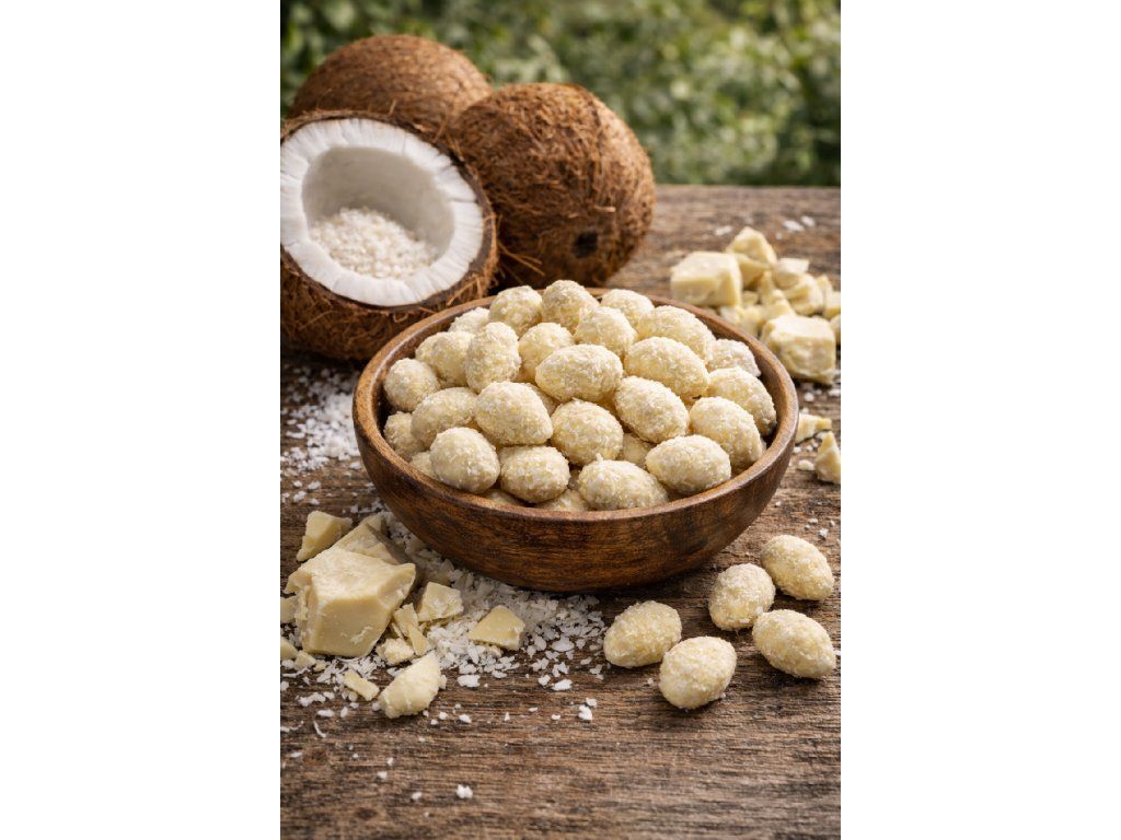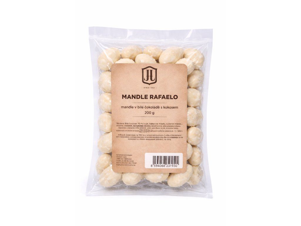 Mandle Rafaelo jsou inspirované oblíbenými pralinkami s kokosovou příchutí. Spojení jemného kokosu a křupavých mandlí přináší lahodný chuťový zážitek.